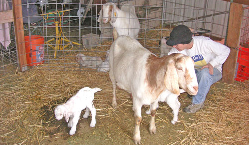 It was about time to feed anyway, so Belinda and I gulped down another swallow and headed for the hay barn. Sure enough, two does had birthed, each with twins. We loaded them into stalls in the nursery barn, made sure each of the kids got a drink, sprayed a little iodine on the umbilical cords, gave the kids a shot of selenium (we don’t have the mineral in our dirt and it is critical to their survival), fed the mothers, and gave them a bucket of water. Once we were done, we headed back to the hay barn and fed all the other goats.