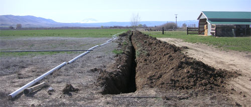 Three hundred and fifty feet of trench dug yesterday. We’re in the process of placing more of our above ground mainline to below ground though our hay/pasture area. This will make haying a little easier and drop our water consumption by a good bit. This morning we are off to an auction to see if there might be a three-point tiller, then back to the farm to begin installing pipe.