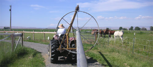We bought our wheelines a number of years ago at an auction in Moses Lake. The lines had been out in the “back forty” for who knows how long. We broke them down and brought them to the farm and have put them back together again as we have needed them. Last Friday we assembled four for the field with Sudan, Emmer, and Wheat. We took them to the field, hooked them up, and turned water on. We found out how lucky we’ve been.