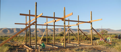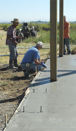 Slabs give a permanence to people’s lives. No one knows what might happen to this slab during the next hundred years, but for this family, it means a home for today and tomorrow. Straw bale construction is quite different from the wood framing of which most homes in the valley are constructed and this says something about this family. The support structure of this home is post and beam. Future straw bales will infill the posts and give walls their shape. As such, the slab is eighteen inches wider than the support posts, all around. Unlike a wood frame home, the anchor bolts are set specifically for the doors and windows, but nowhere else along the wall-line since bales have no need of them. As the last location of bolts was marked on the outside of the form boards, and the last neighbor arrived to help with the pour, the concrete truck turned into the drive.