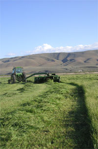 She trots along a windrow to front and side of the tractor. Pewter gray along the back, her hair lightened as it moved down her side to the belly. As the dark gray hair slide off her back and down her tail it lightened a little then in the last four inches burst black and bushy. Pushing up the neck, gray gave way to the brownish gold of newly cut cedar as it slipped between her ears. Flowing down and across her cropped sleek face, darker and lighter hair blended giving modeled overtones before ending at her black nose. Trotting, she dives into the windrow, here and then there, after a field mouse who lost its home in the cutting of hay. The high shady protective alfalfa landscape, home to mice, voles, and gophers, has changed to an open barren landscape as the swather cuts and sweeps hay into windrows and leaving little more than three-inch stems behind. The only protective cover left for a mouse or a vole is the windrows, and they are unfamiliar space.