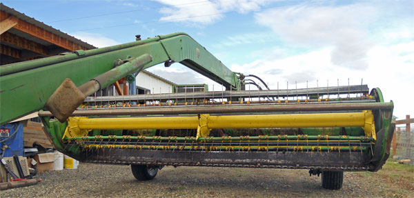 It isn’t so much that I walked away from the swather as it was I got it oiled and greased after the last cutting then put away. Enough done if there was another cutting in the next few weeks, but not enough if it were to be put away for the winter. Luckily, the weather has warmed up for few days. So, we pulled the swather up to the shed yesterday and cleaned the alfalfa and grass out of the nooks and crannies. In a number of places, seed had already sprouted and plants beginning to make their presence known, which led to washing everything down. Next the knives, rollers, chains and belts were inspected, adjusted, and oiled.