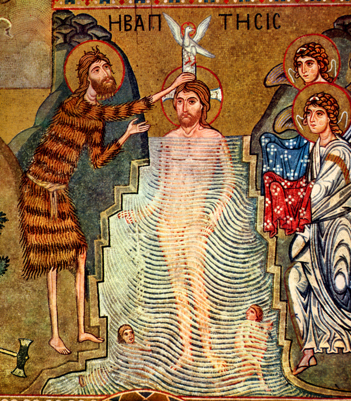 The photo is a mosaic of the “Baptism of Christ,” created in the mid-12th century. Found at the Cappella Palatina di PalermoI in Palermo, Italy.