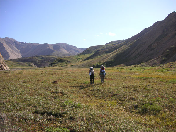I first met Denali when Belinda, Katherine, Rebecca, and I hiked her backcountry. The backcountry is a wide and open landscape without trails. Denali Park is similar with only one road in and the same road out. Buses provide all transportation within the park. Thus, day hikers, backpackers, and folk who want to see the park inside from the bus all ride together. When hikers reach a portion of the park they want to hike, they yell out, the driver stops, and they jump off and watch the bus head on down the gravel road. If they are not alongside the road when the last bus heads back out of the park, well, they get a free night out.