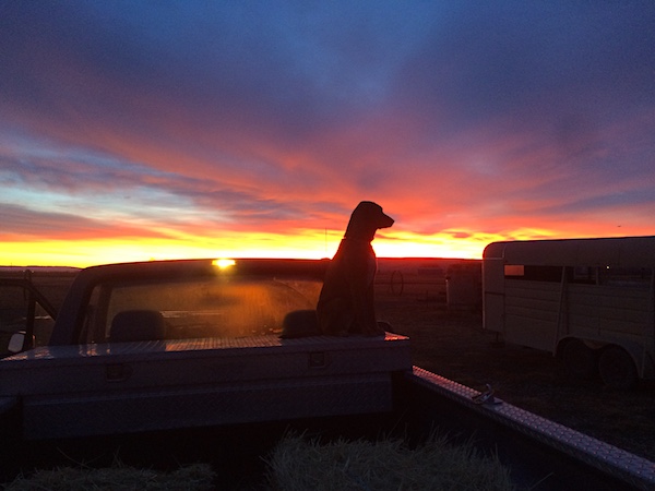 Dawn. Sage and I finish feeding cattle. We turn our attention to loading hay for tomorrows morning feeding—she keeps guard from atop the trucks toolbox while I load bales. The cold morning holds little of what will come in the winter months ahead, just the same the cold is doing well holding forth a frosty morning—Sage chooses to stand more than sit on the trucks cold toolbox.