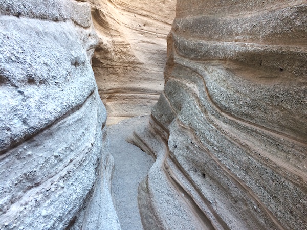 A good stone’s throw up canyon it narrowed. The slopes lost their laid-back lean in favor of a more vertical nature. Favoring terminology of wall rather than slope the canyon walls narrowed as we walked. When the wash was little more than two or three feet wide and the walls closed in overhead, the canyon had lost any feel of what I think of as canyon. But then that feeling was of another land culture. The people of this landscape, though, add a descriptor to this canyon ground: slot. Slot canyon fits well for the walls become so steep, so vertical, few plants find even the smallest of a perch to settle upon and live. And should a seed make its way to some mid-wall ledge, the chance of enough rain finding its way between the walls to afford the seed a chance toward bringing for the life within is small.
